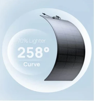وزن این پنل تنها ۲.۳ کیلوگرم است و با ابعاد ۱۰۵۵ در ۶۱۲ در ۲۵ میلی‌متر، به‌راحتی قابل حمل است. رتبه IP68، مقاومت در برابر آب و گردوغبار را تضمین می‌کند. انعطاف‌پذیری تا ۲۵۸ درجه، نصب روی سطوح منحنی مانند سقف ون یا قایق را ممکن می‌سازد.